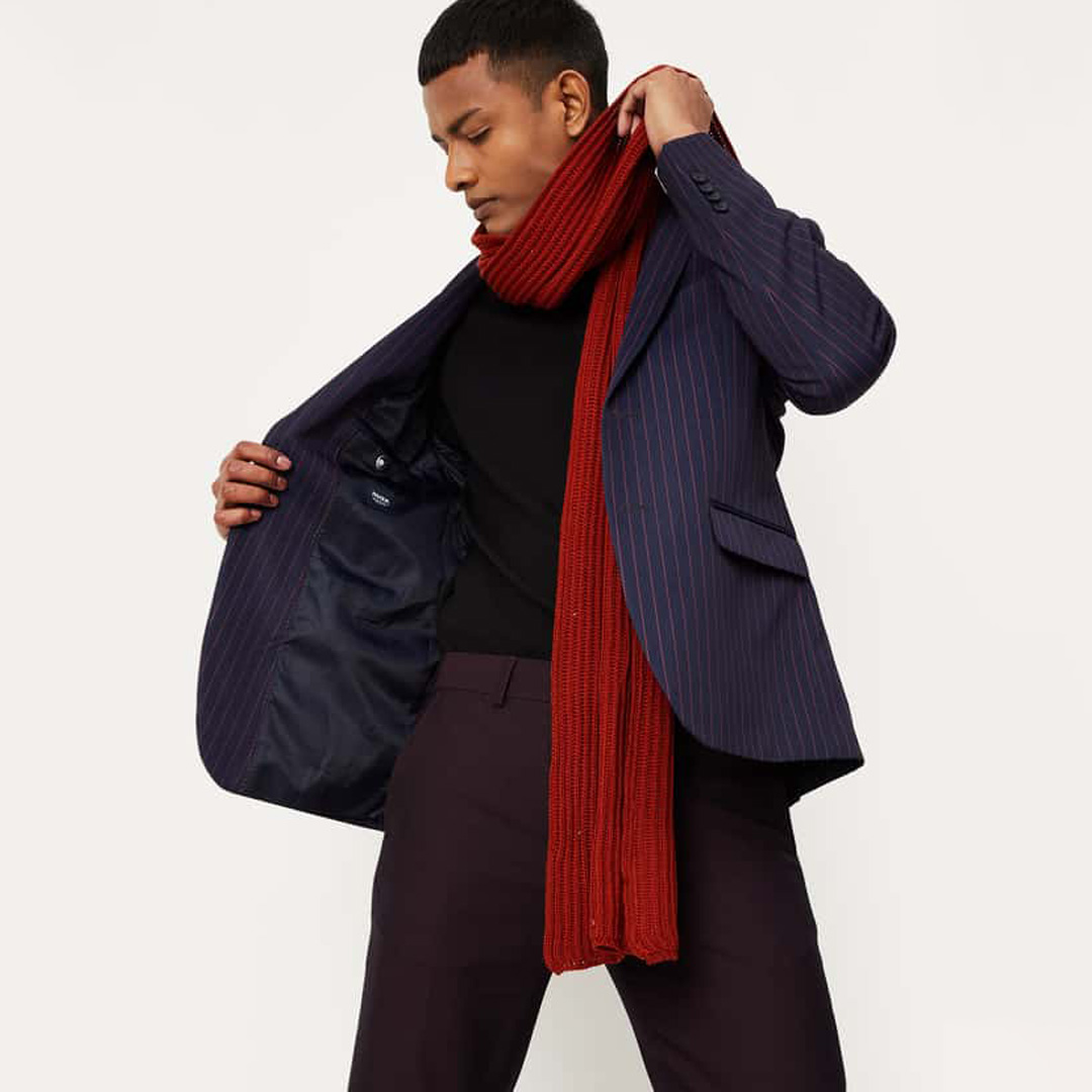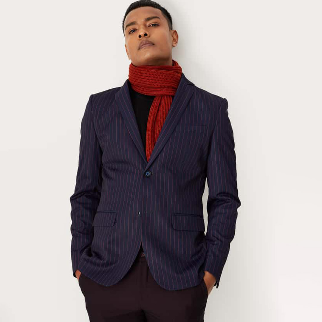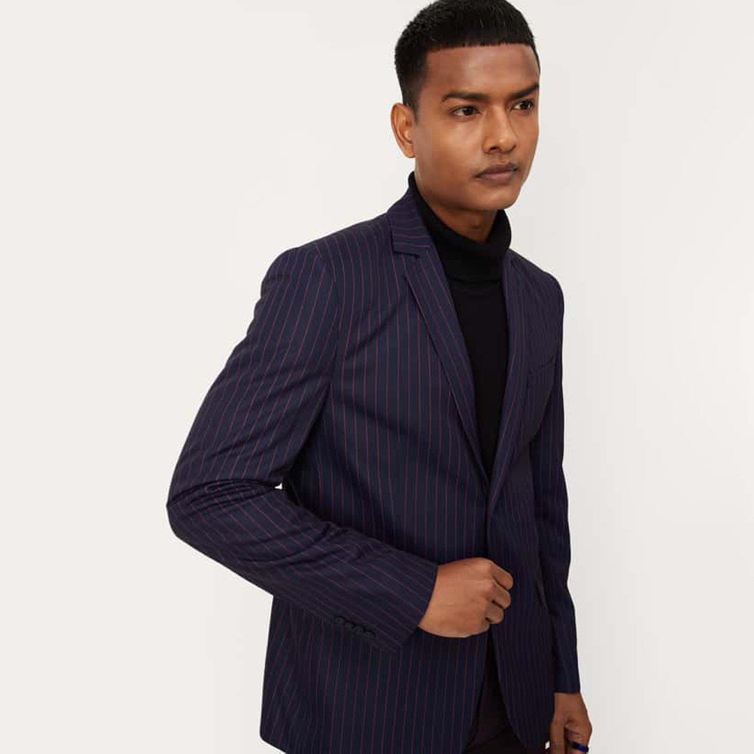Look dapper by layering your outfit with this blazer. This classic design is styled with a striped pattern, lapel collar, long sleeves, a 2-button front, a chest welt pocket, and flap pockets. Complete the style by layering this blazer over a sweater and team up it up with trousers and formal lace-ups.