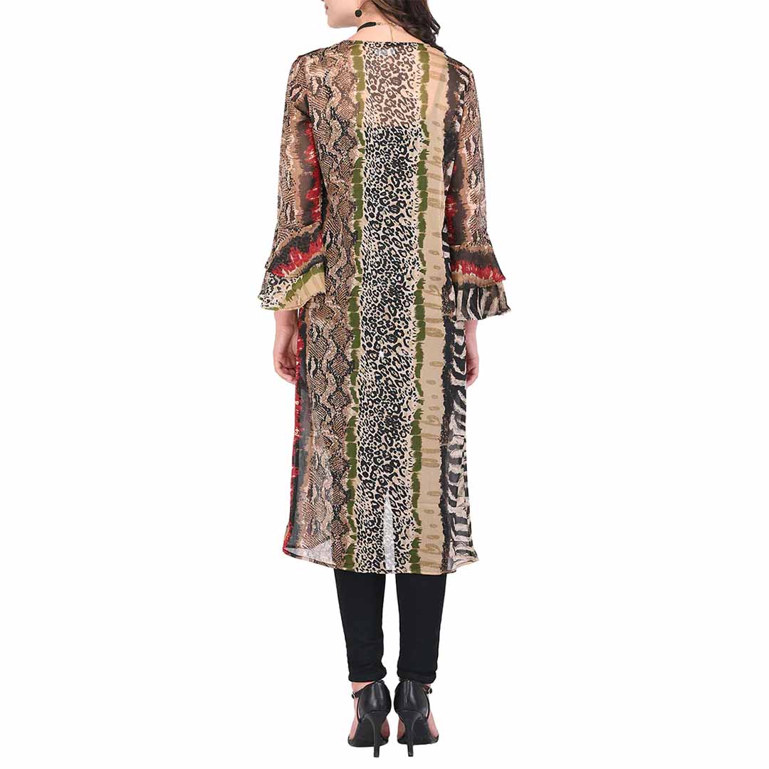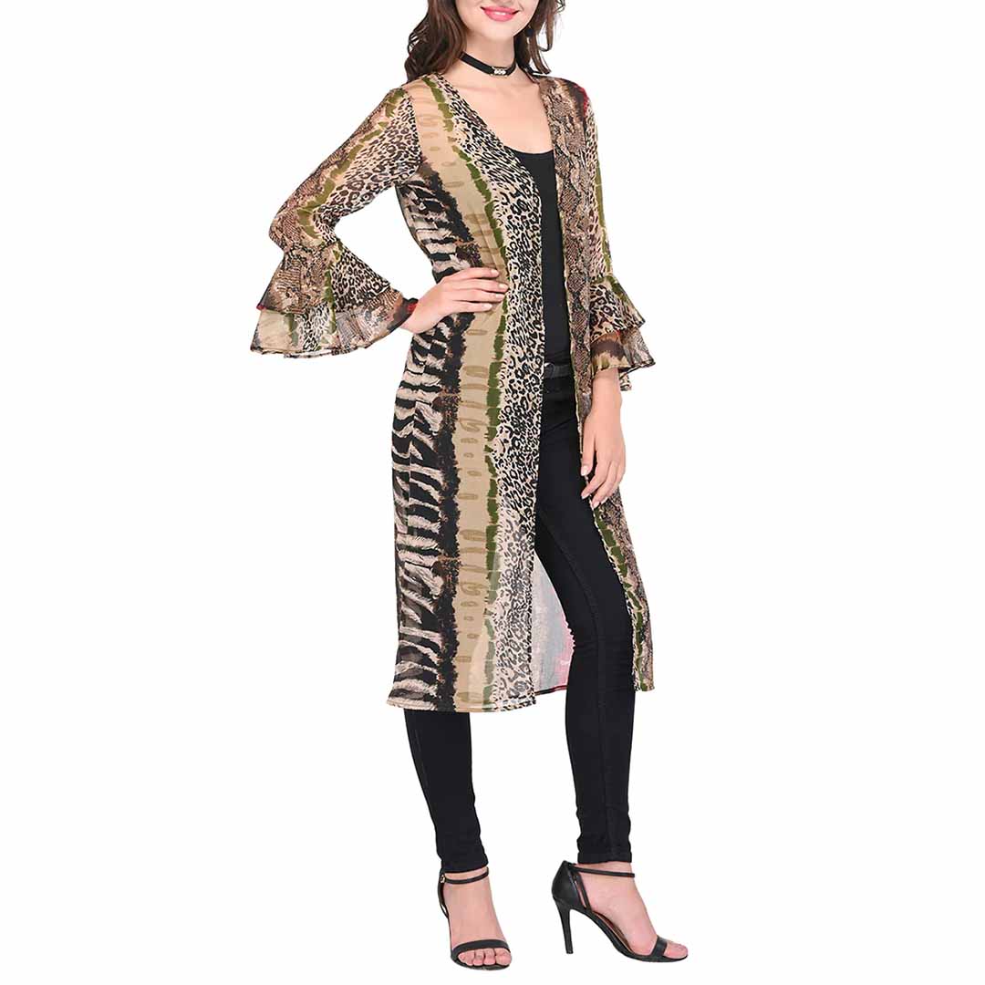 animal printed double bell sleeves shrug revamp your ethnic collection with the all-new ethnic collection of traditional shrugs with the right blend of modern style and native designs. when in doubt, go for multi shaded shrugs which work well with every attire and are suitable for any casual or ethnic occasions that instantly add glamour to your whole attire.