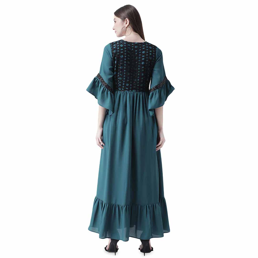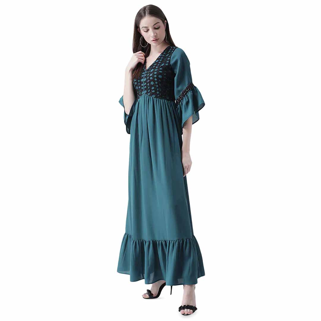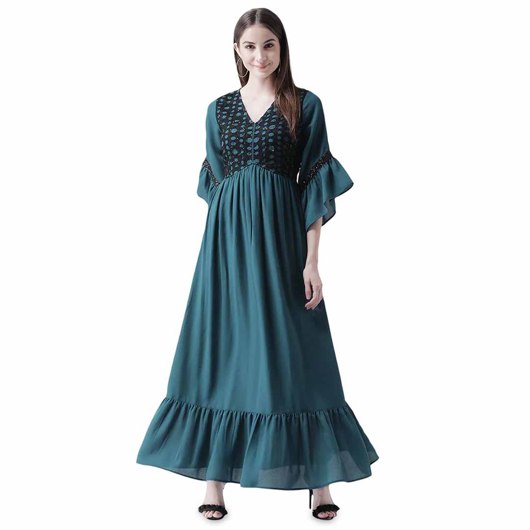 bell sleeved gathered hem maxi dress looking for some awesome collection of dresses? well, lay your hands on this dress and also get the option of choosing from multi colour. dress up in a soothing pattern and don this dress made of polyester material.