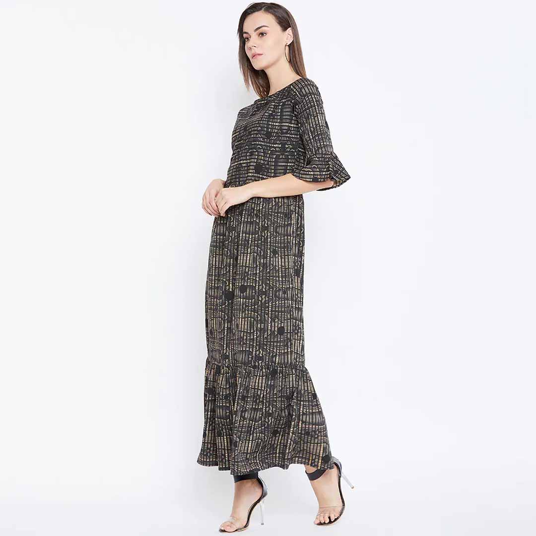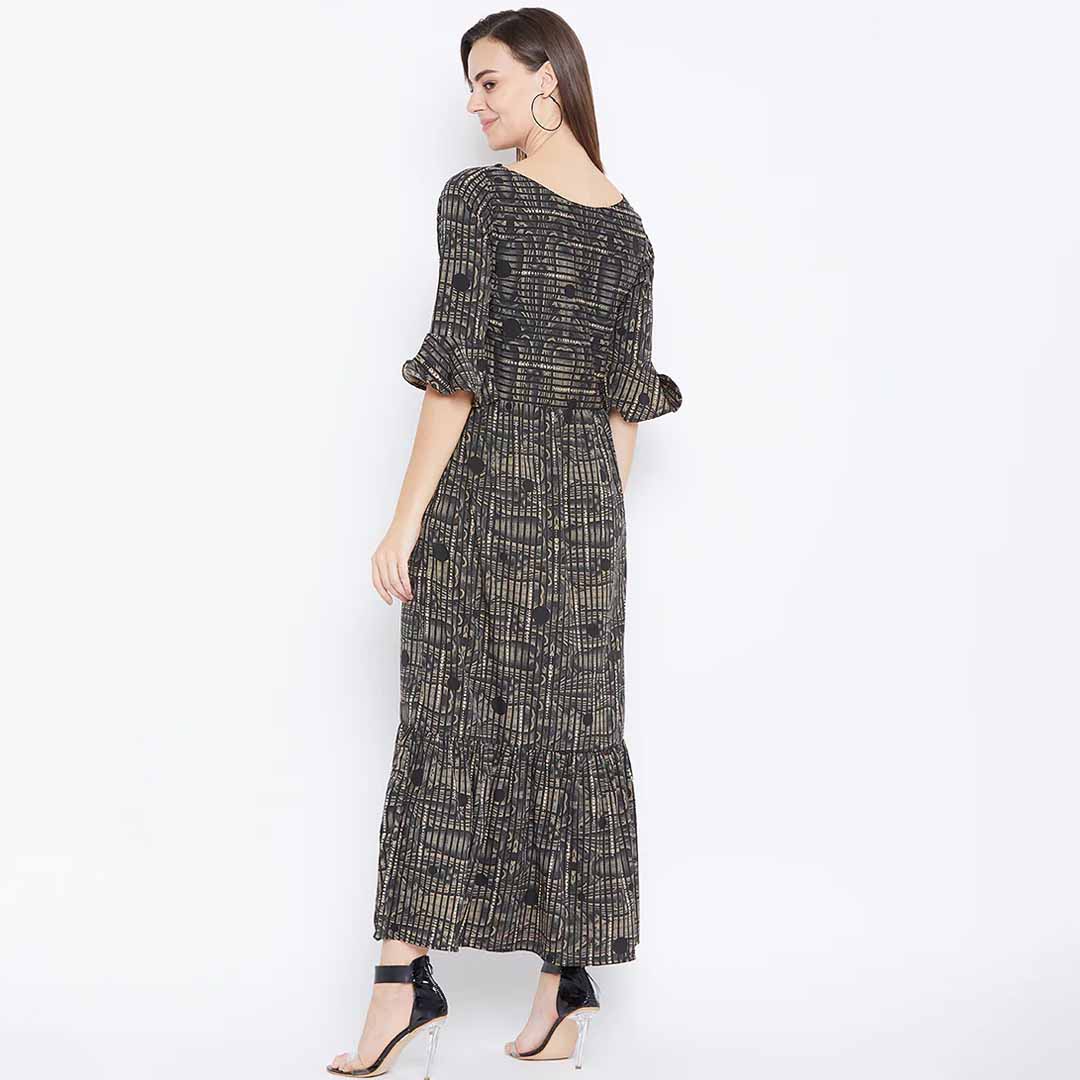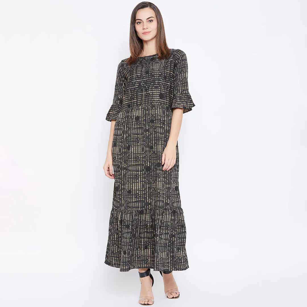 bell sleeved gathered maxi dress looking for some awesome collection of dresses? well, lay your hands on this dress and also get the option of choosing from black colour. dress up in a soothing pattern and don this dress made of crepe material.