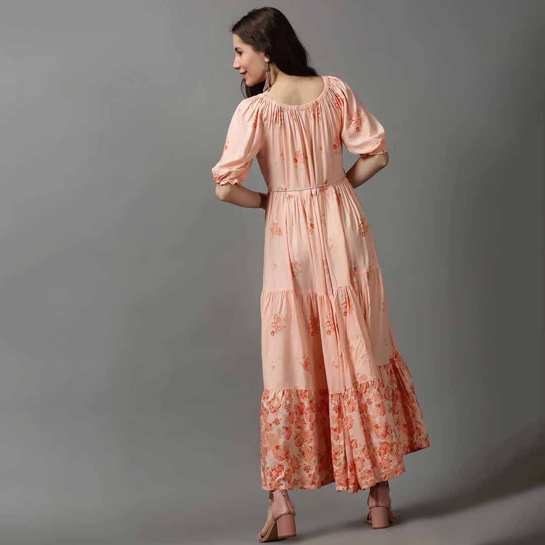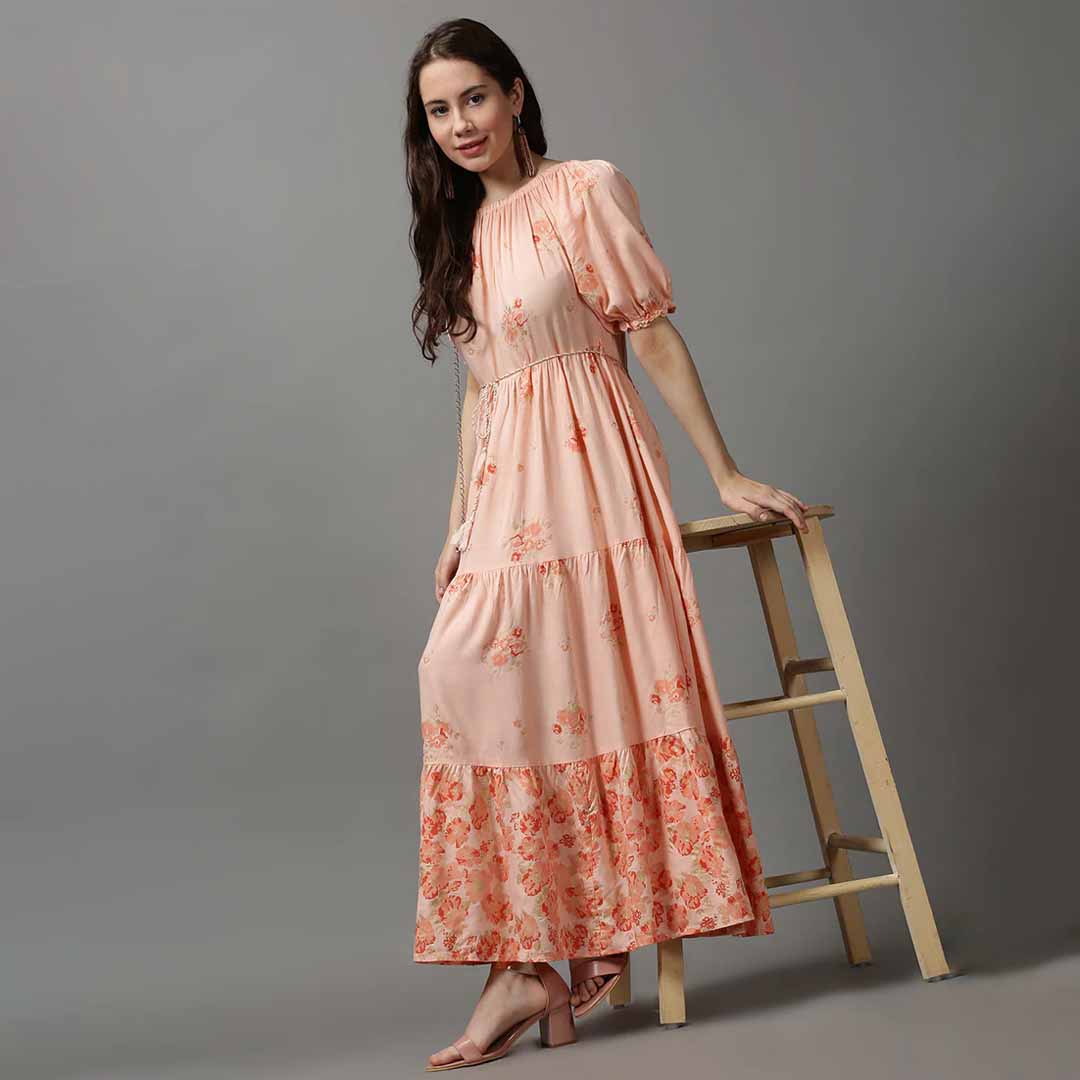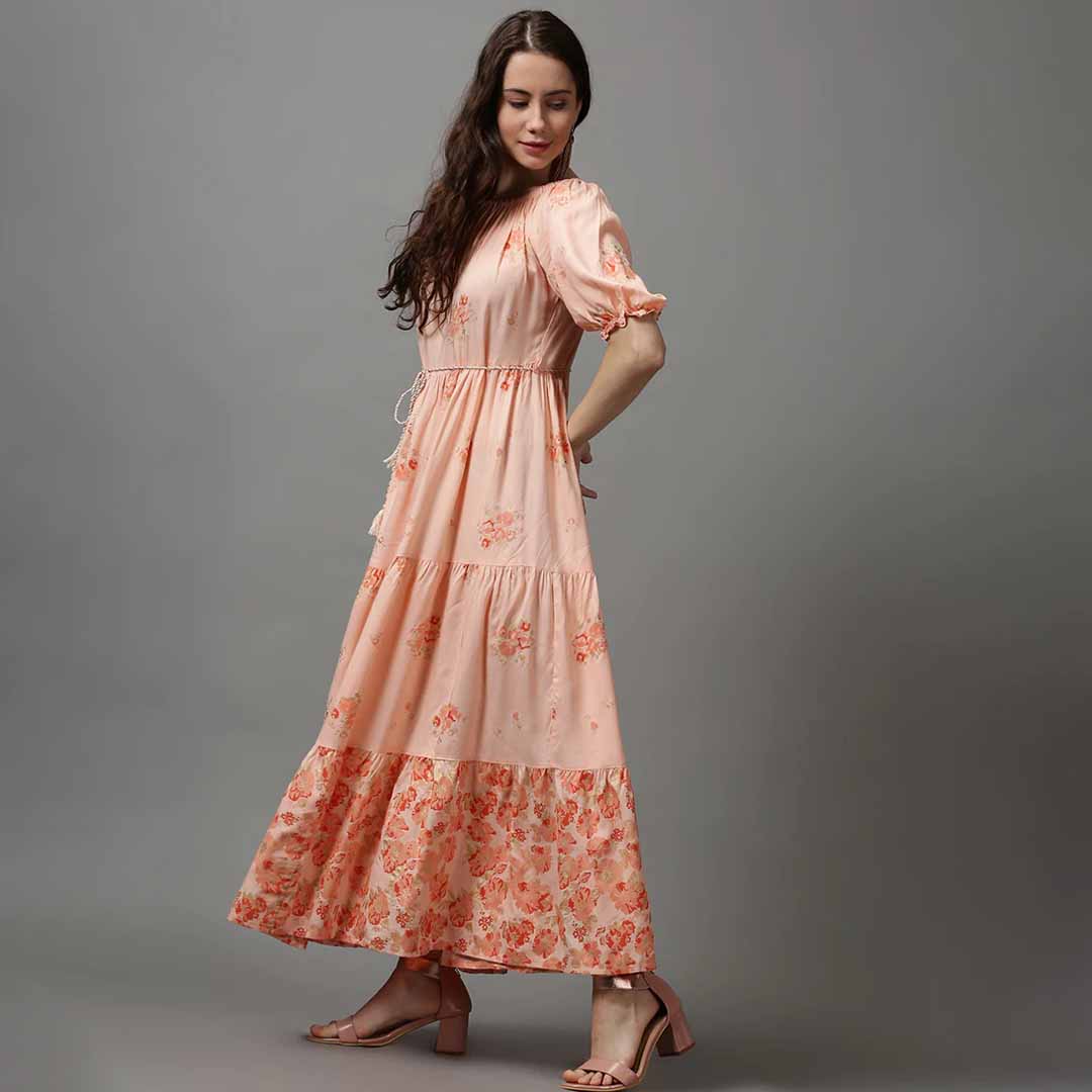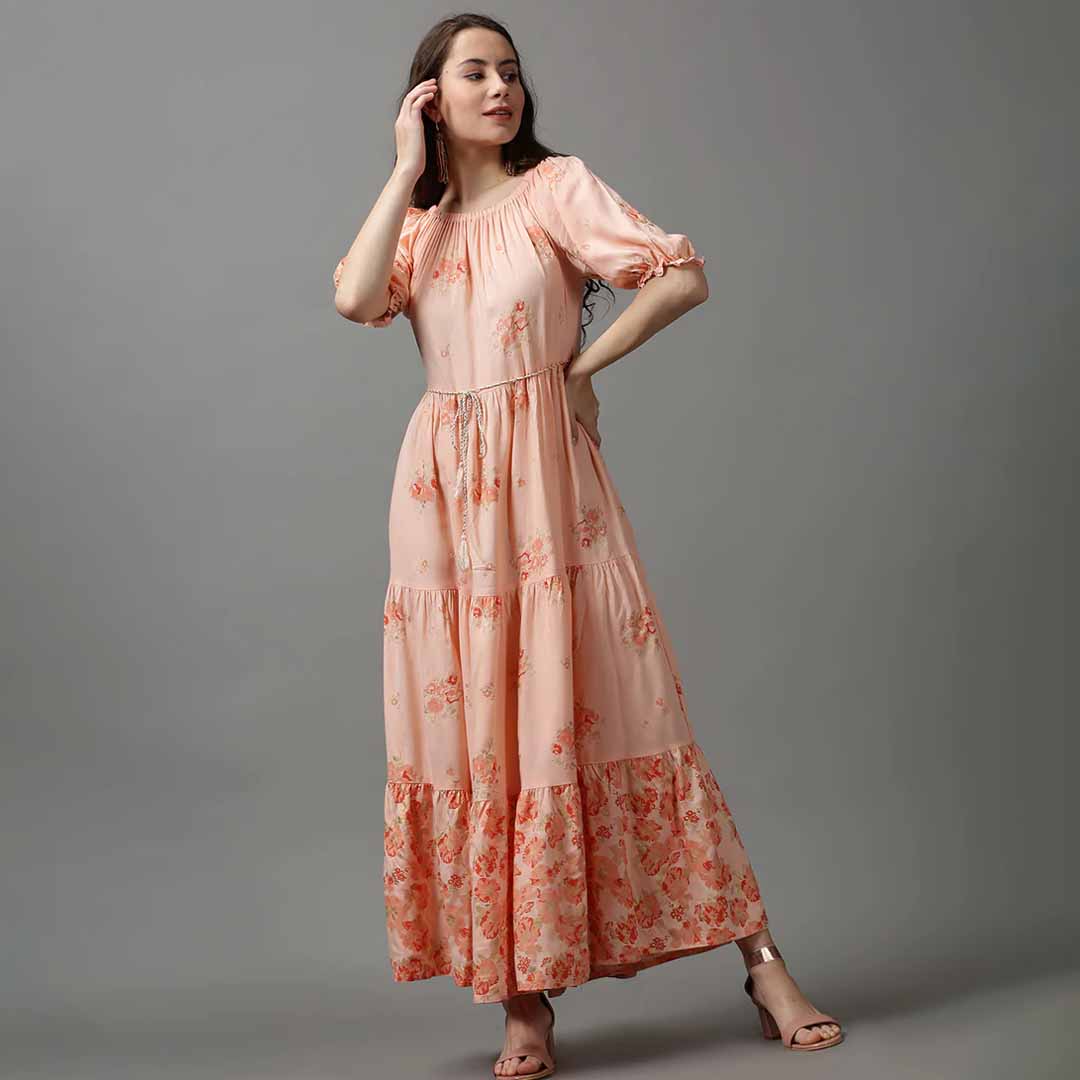 floral tiered maxi dress looking for some awesome collection of dresses? well, lay your hands on this dress and also get the option of choosing from peach colour. dress up in a soothing pattern and don this dress made of cotton material.