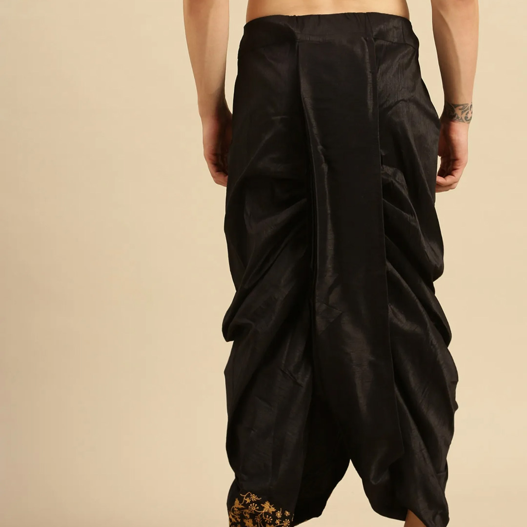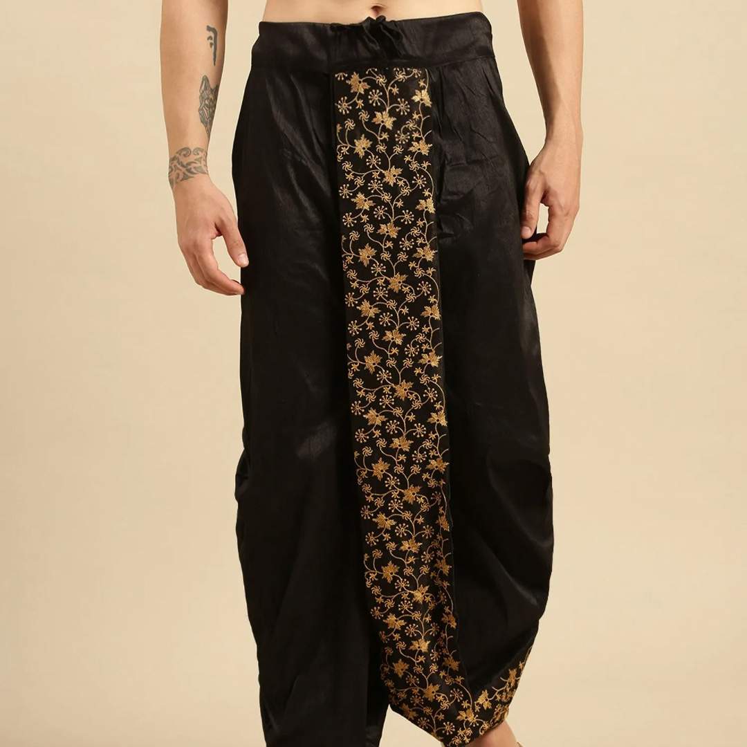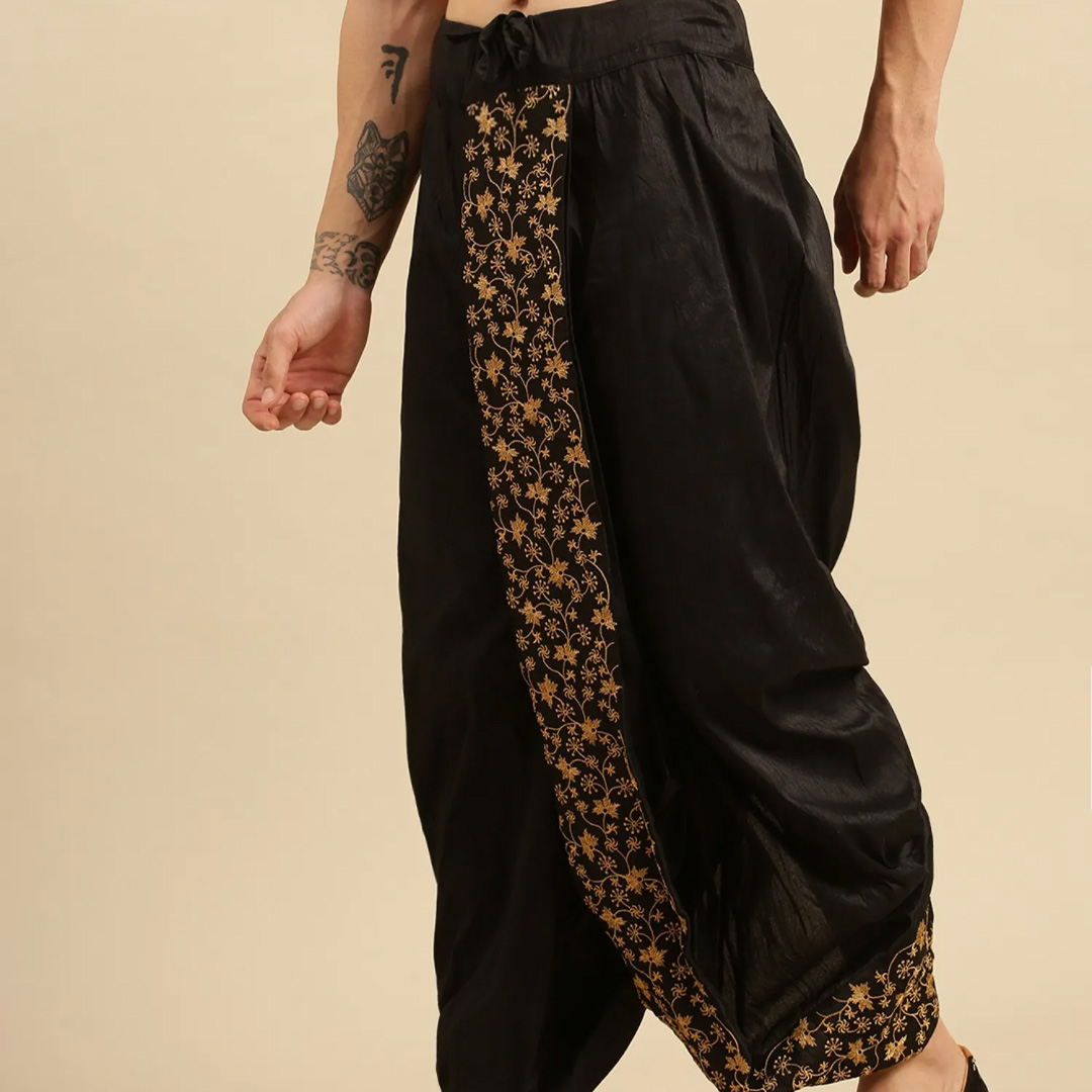 introducing these black coloured mid-rise art silk fabric various design of dhoti in a pant style for a hassle free comfortable wear.Has pleats throughout the outerpart with gathers and intricate embroidered detailing and has an elasticated waistband secured with a drawstring fastening.Suitable for any occasion, any festival, party celebrations, its fashionable as well as tradional, we can pair it with a matching or a contrasting kurta and to complete the look wear a mojari or jutti.