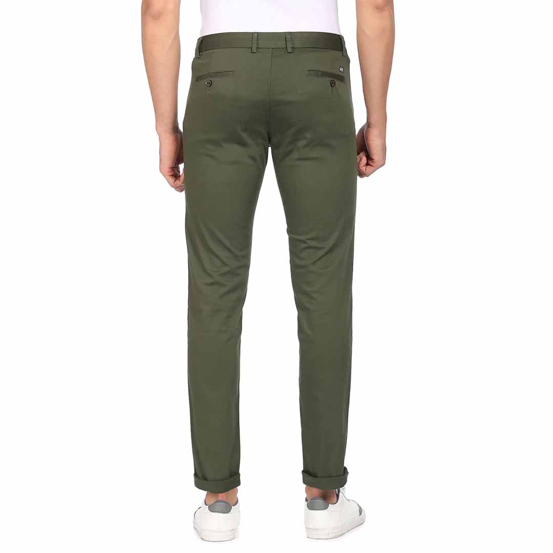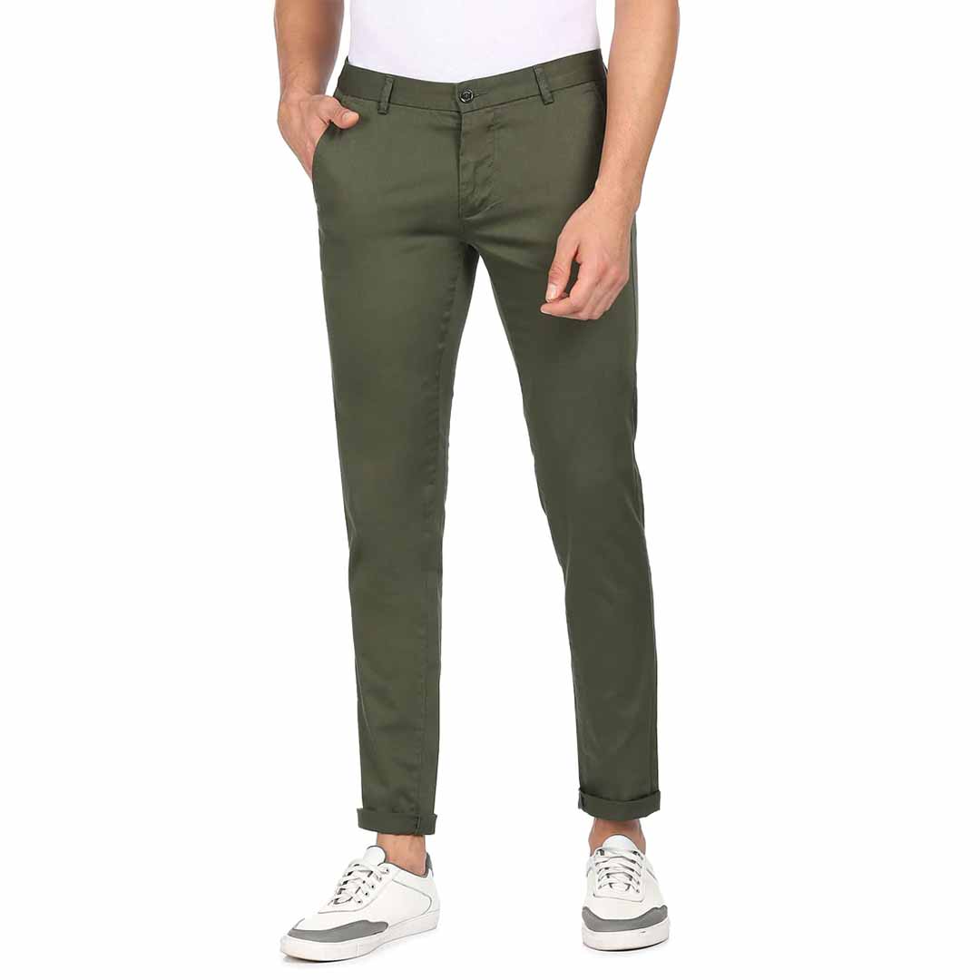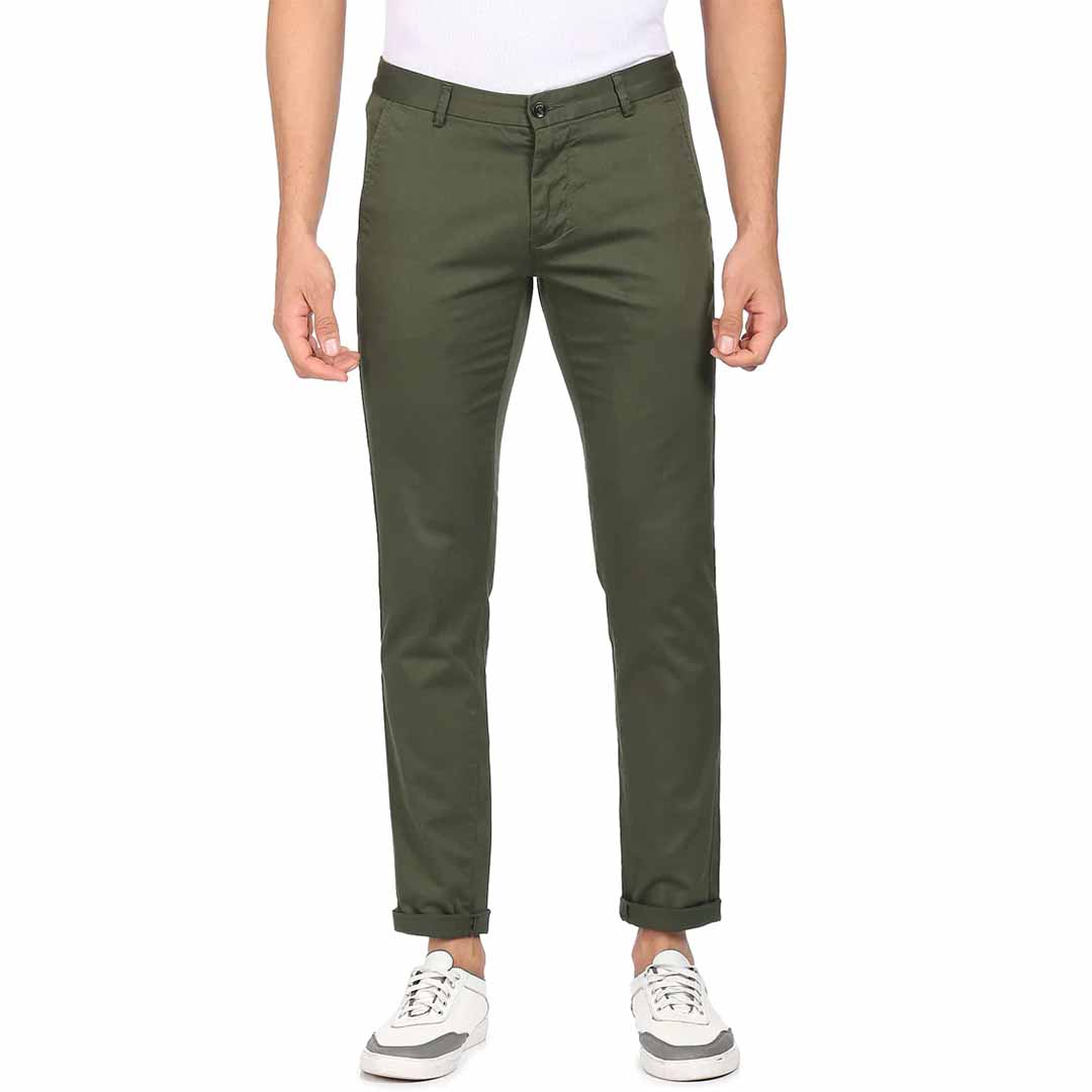 level up your wardrobe essentials with this stylish pair of slim fit trousers from arrow. the cotton spandex blend fabric of the trousers ensures an impeccable fit and comfort. match them with a solid t-shirt and your favourite pair of sneakers for a relaxed, casual look.
