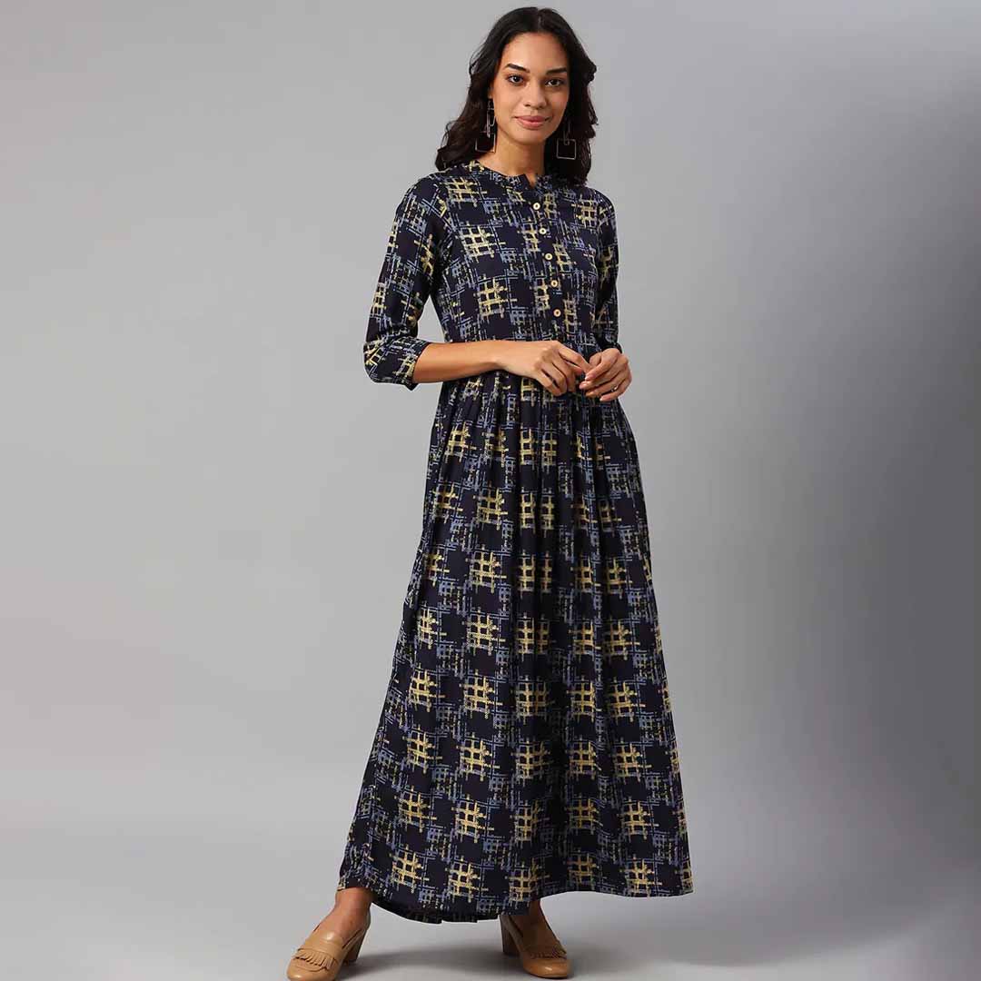 neck printed maxi dress looking for some awesome collection of dresses? well, lay your hands on this dress and also get the option of choosing from navy blue colour. dress up in a soothing pattern and don this dress made of rayon material