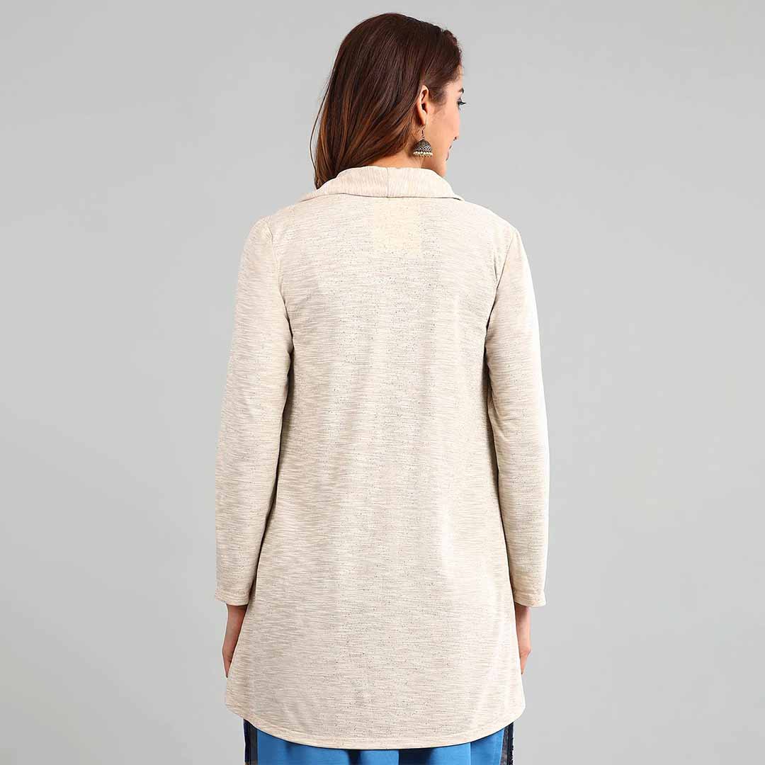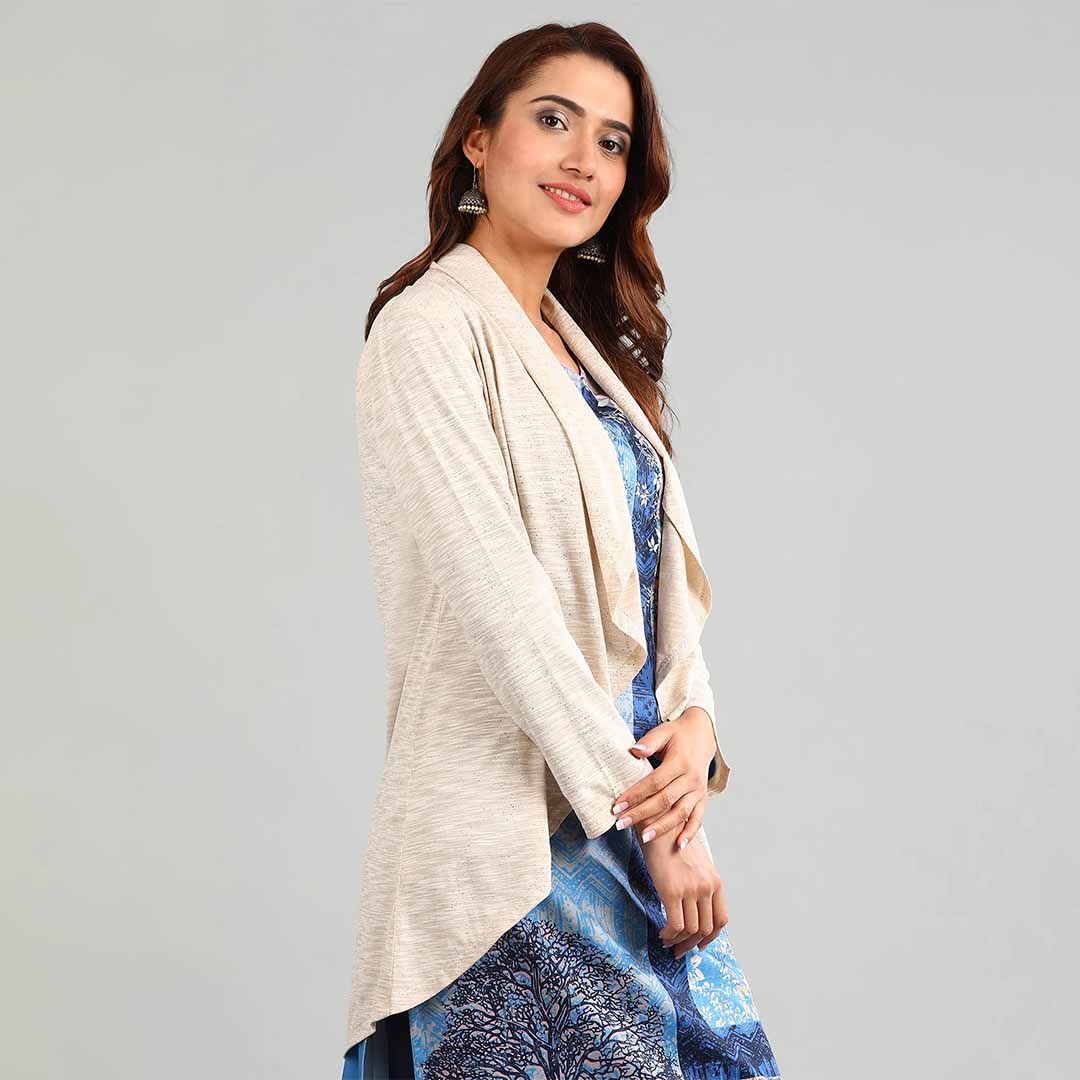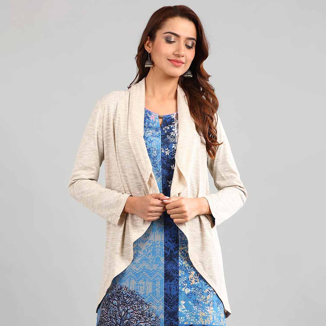 beige shawl neck yarn-dyed gilet with asymmetrical hemline revamp your ethnic collection with the all-new ethnic collection of traditional shrugs with the right blend of modern style and native designs. when in doubt, go for beige shaded shrugs which work well with every attire and are suitable for any casual or ethnic occasions that instantly add glamour to your whole attire.