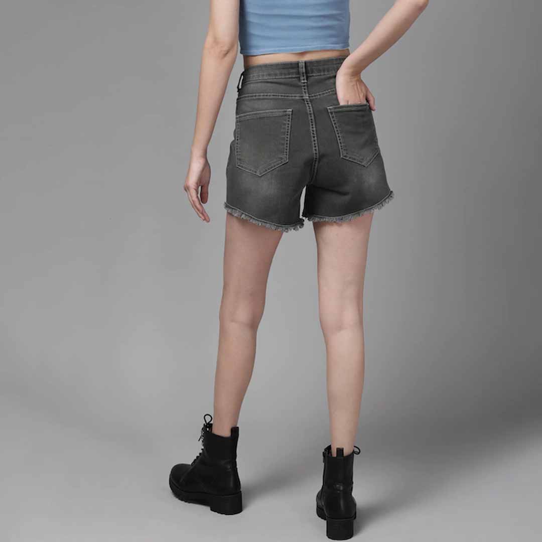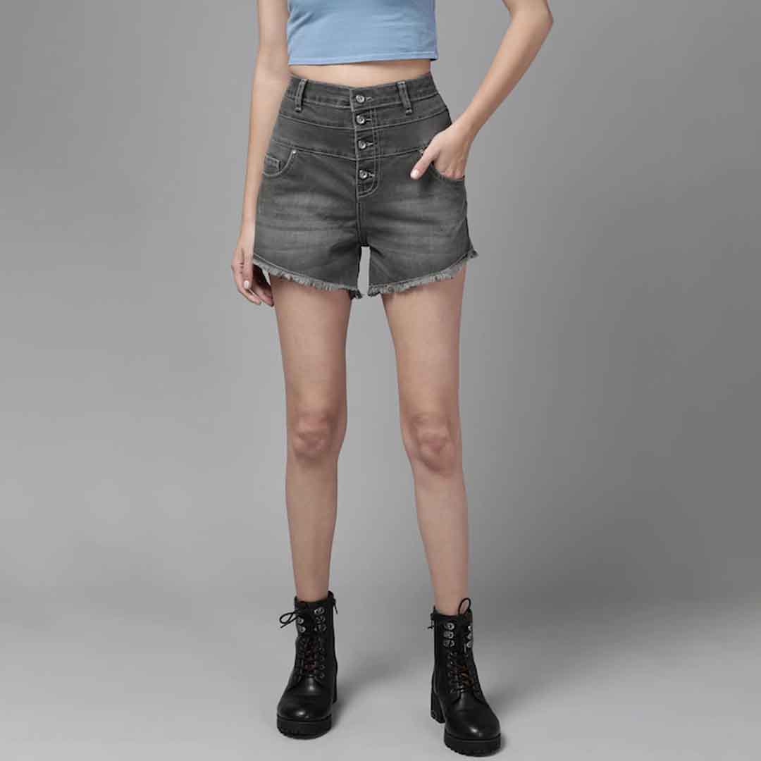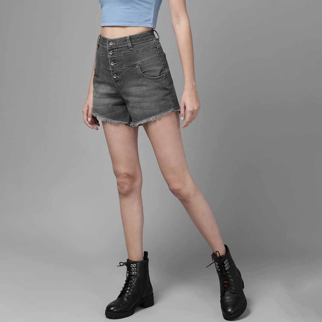 Charcoal solid high-rise denim shorts, has 5 pockets, button closure