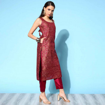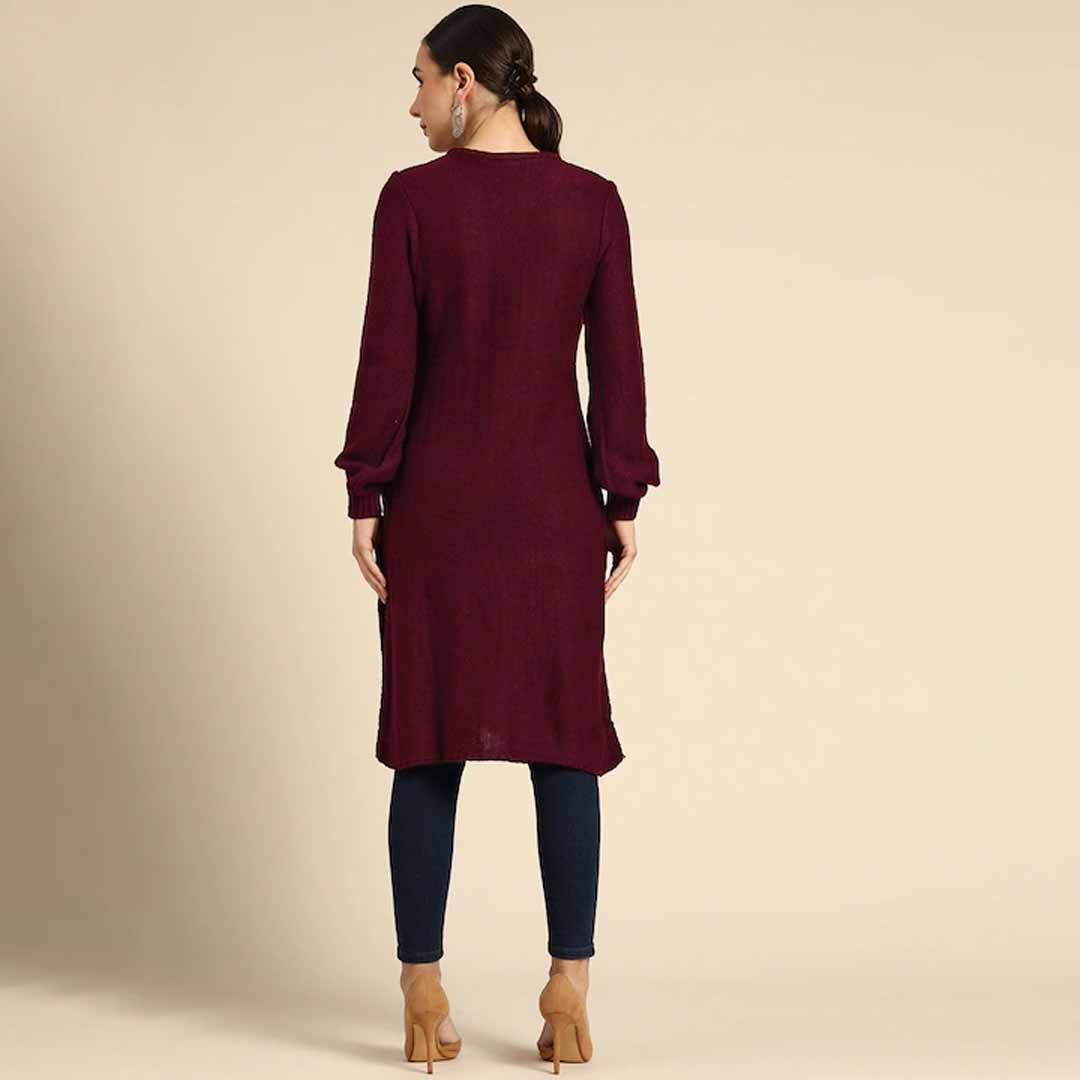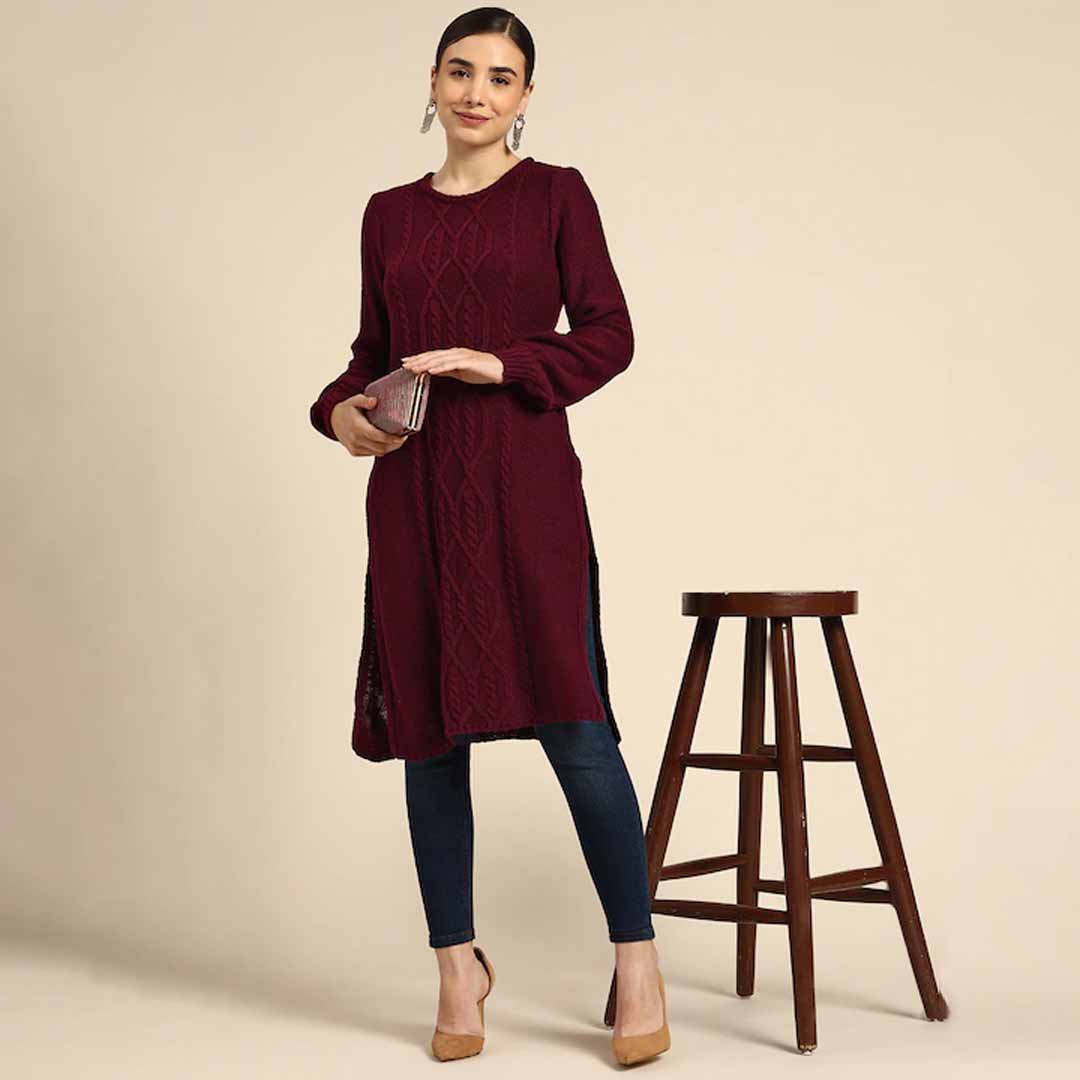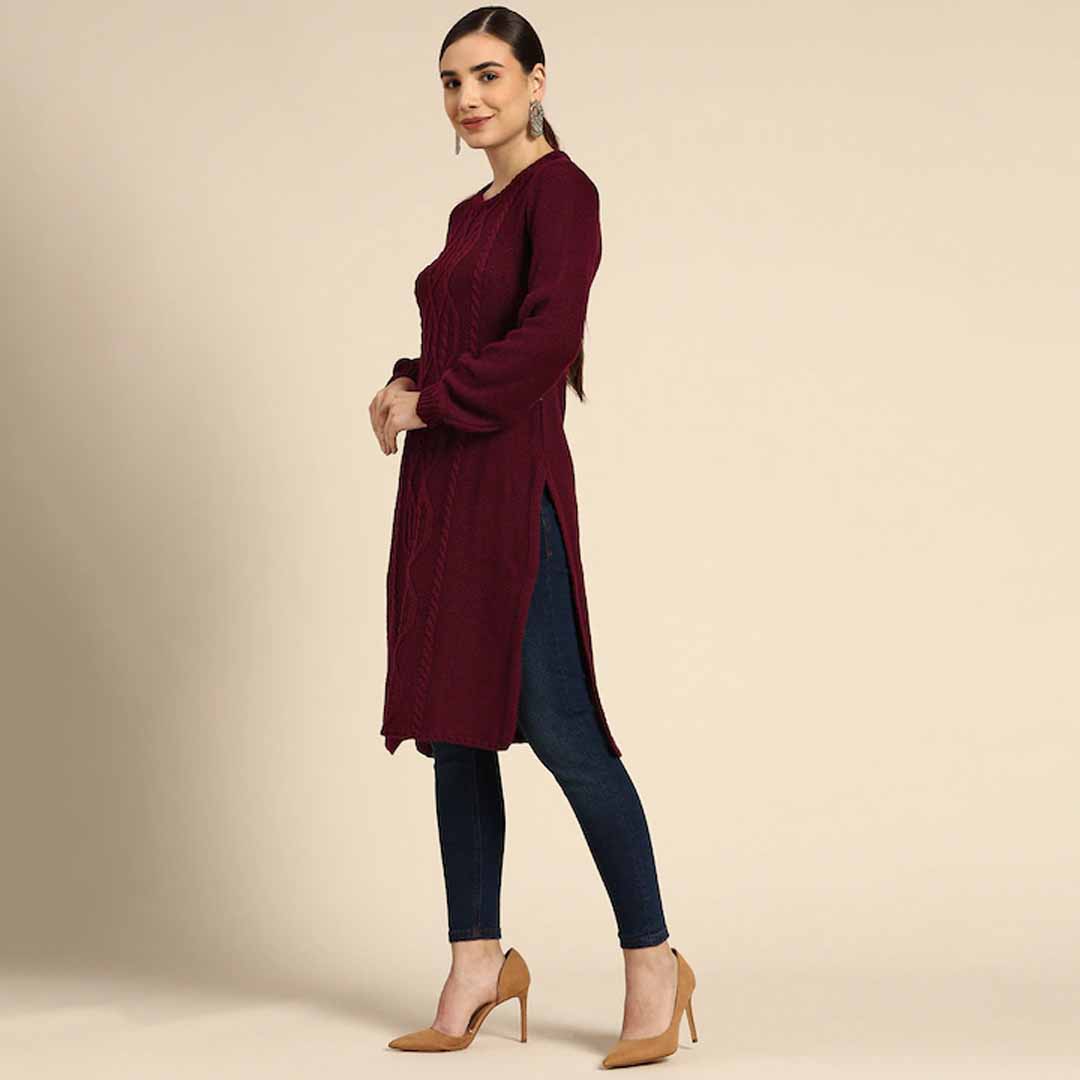 Colour: Maroon Woven design, cable knit Round neck Long, puff sleeves Straight shape with regular style Knee length with straight hem Knitted fabric
