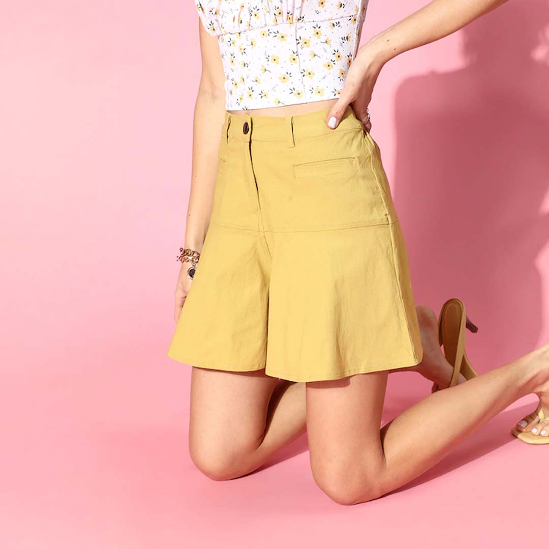 Mustard solid mid-rise regular shorts, has 2 pockets, button closure