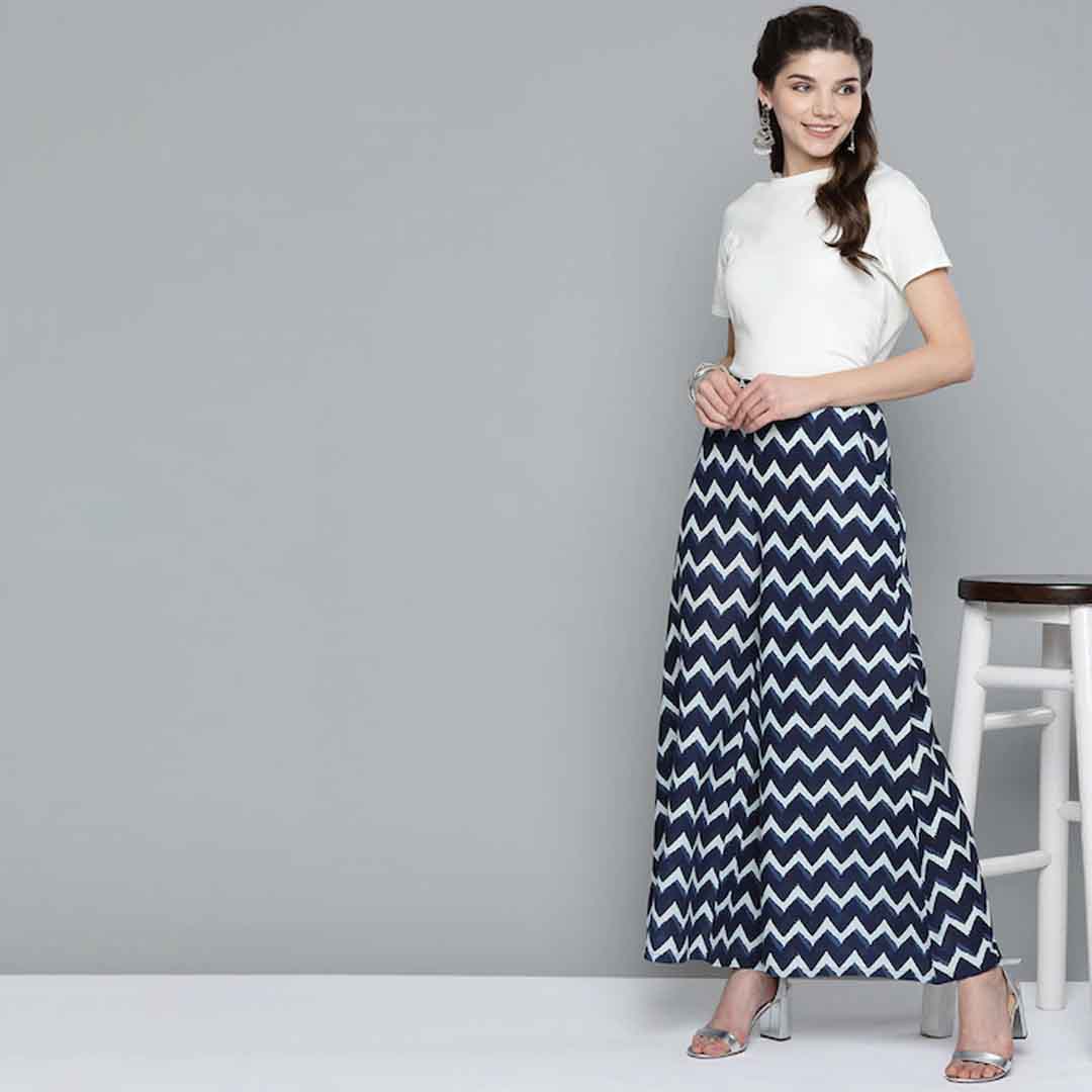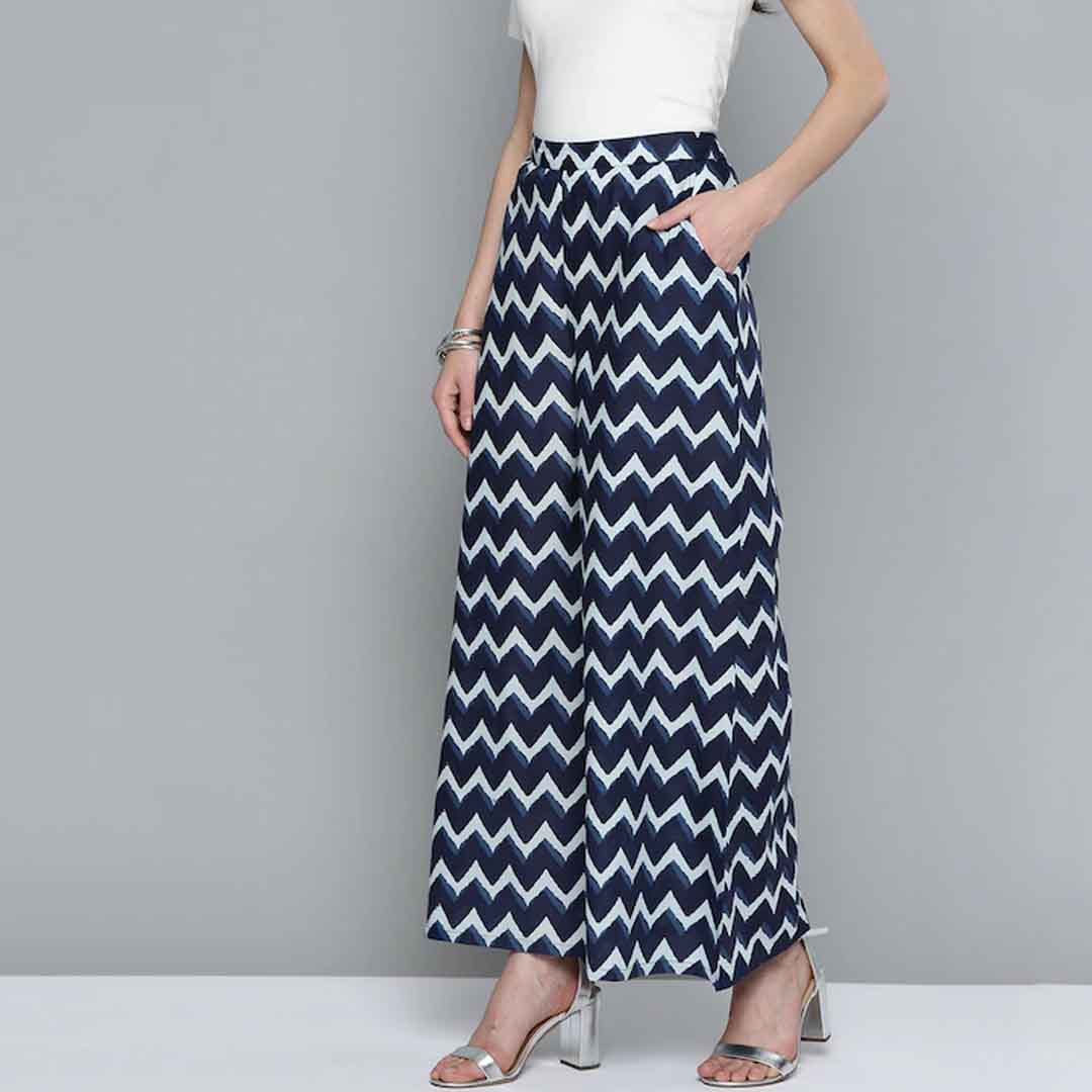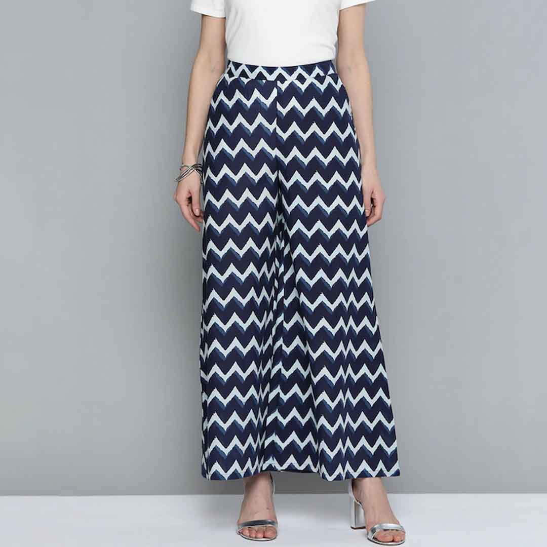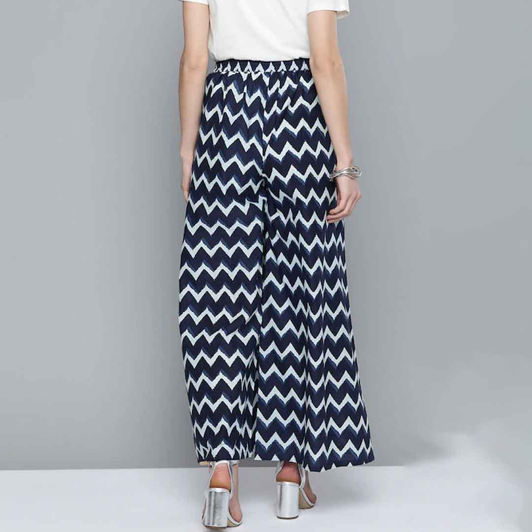 Navy Blue and White chevron print woven wide leg fit Palazzos