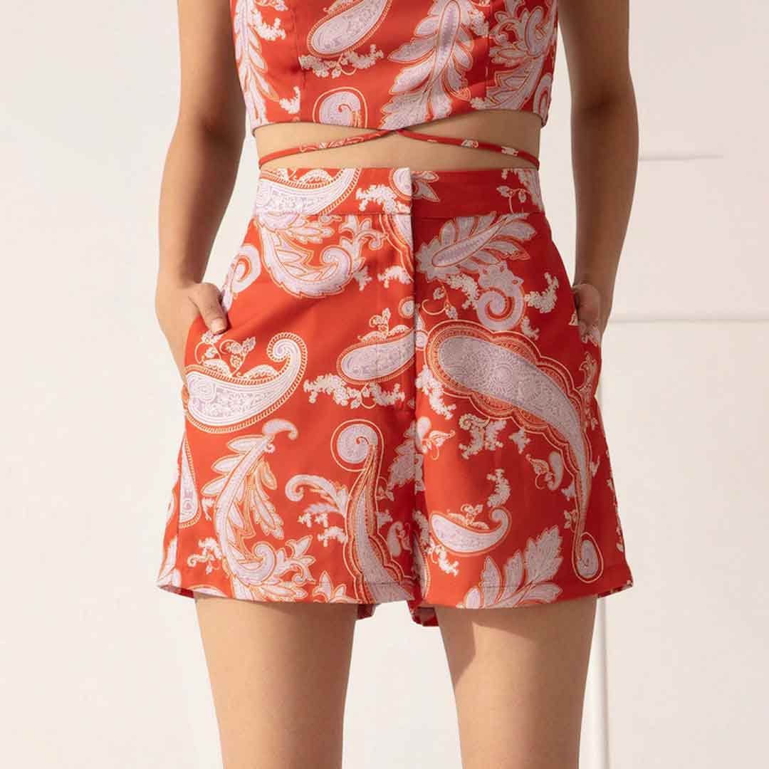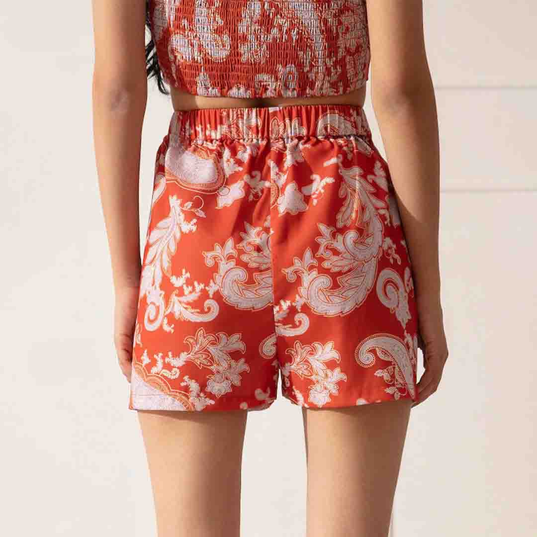 Rust floral printed high-rise regular shorts, has 2 pockets, hook closure