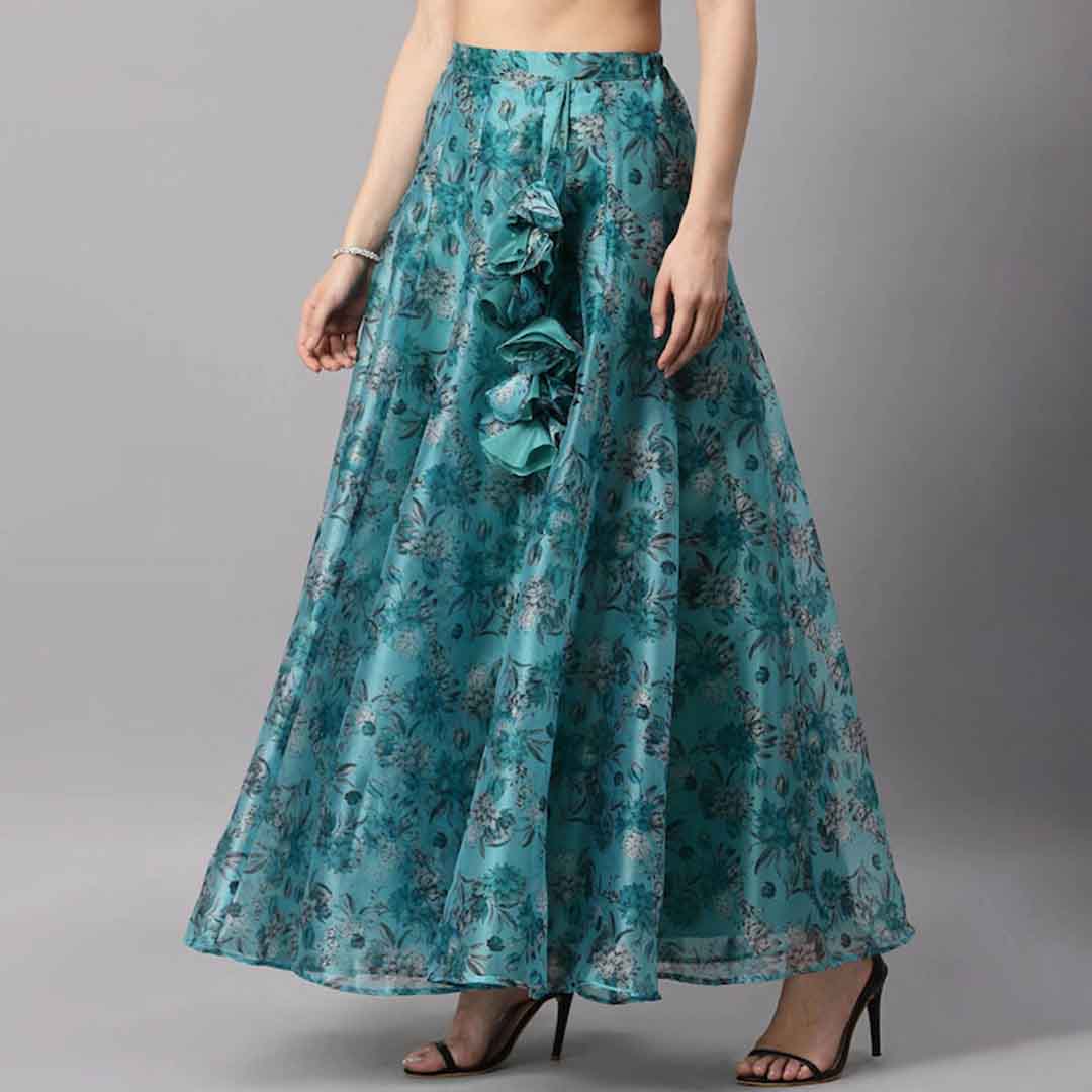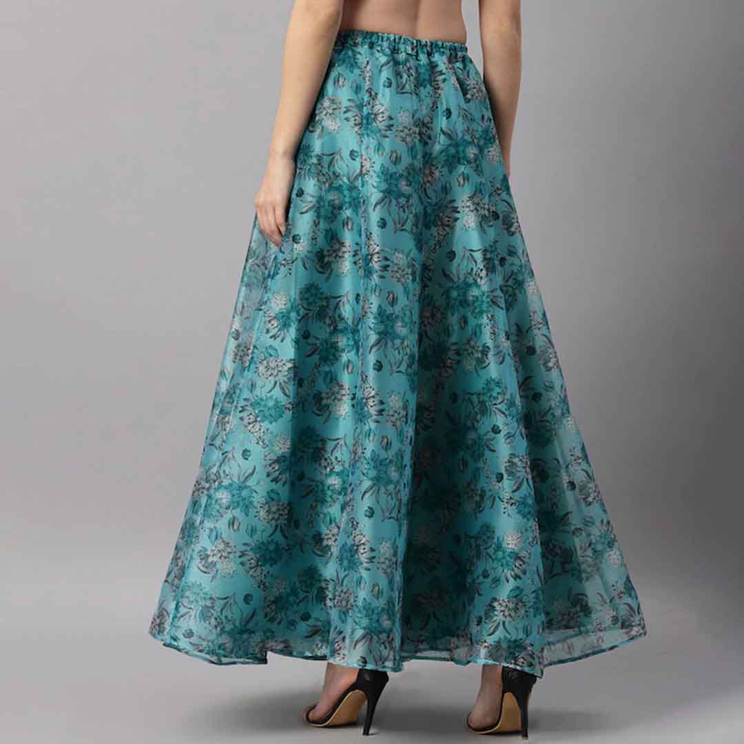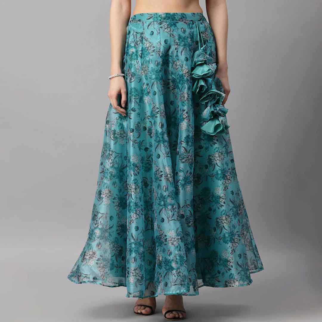 Turquoise blue floral printed flared maxi skirt has an waistband with zipper closure, tassel details and flared hem